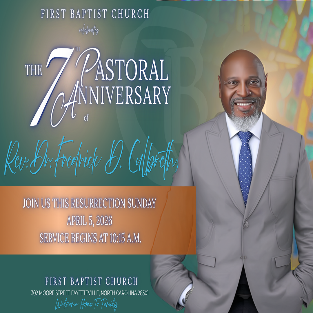 FBC Family & Friends, on this day, not only do we celebrate the resurrection of our Lord & Savior Jesus Christ, we are also celebrating the 7th Pastoral Anniversary of Rev. Dr. Fredrick D. Culbreth here at First Baptist Church! Join Us at 10:15am TOMORROW and let`s have an awesome time in the Lord!