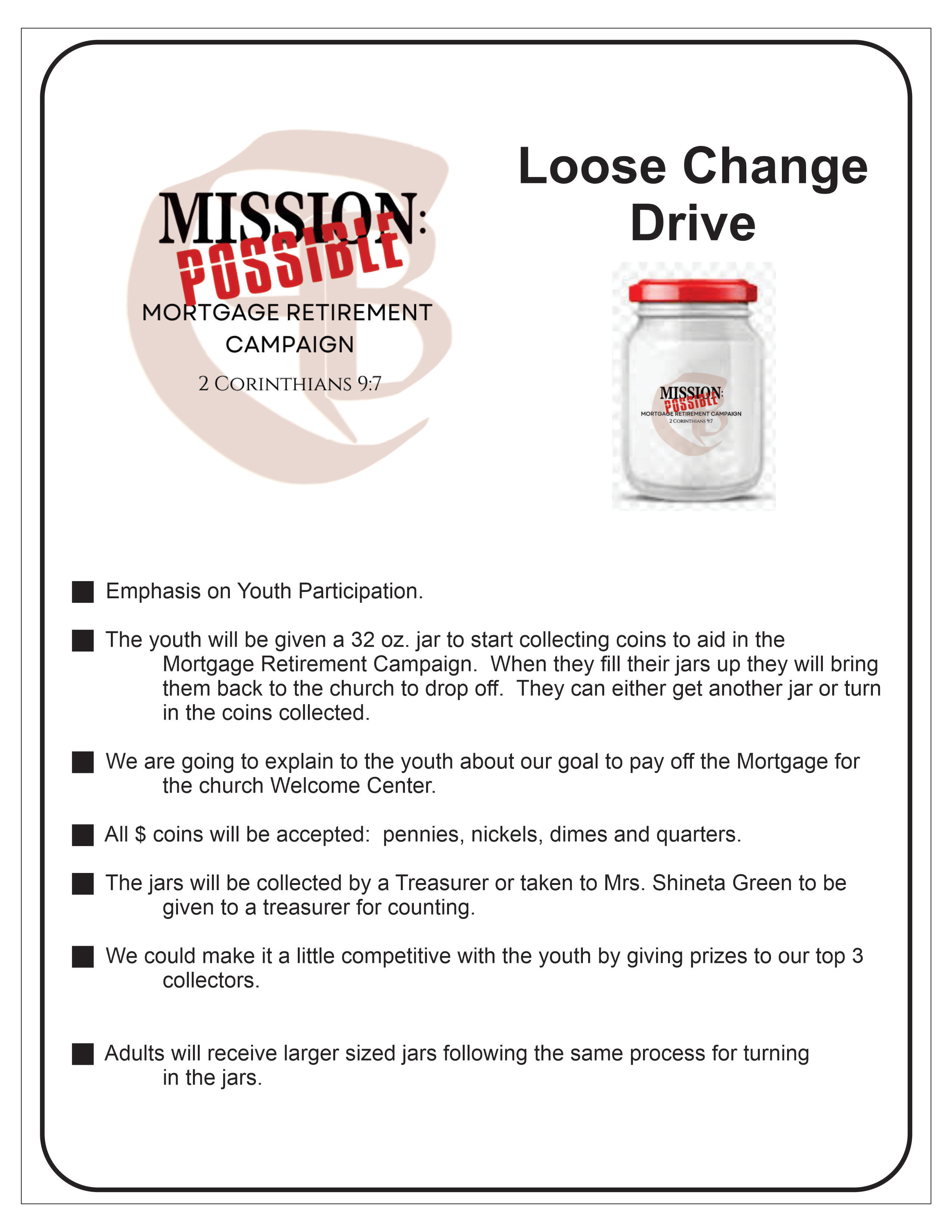 Collect all loose change in jars provided. Small jars for youth, large jars for adults. “Fill Them Up and Bring Then In”