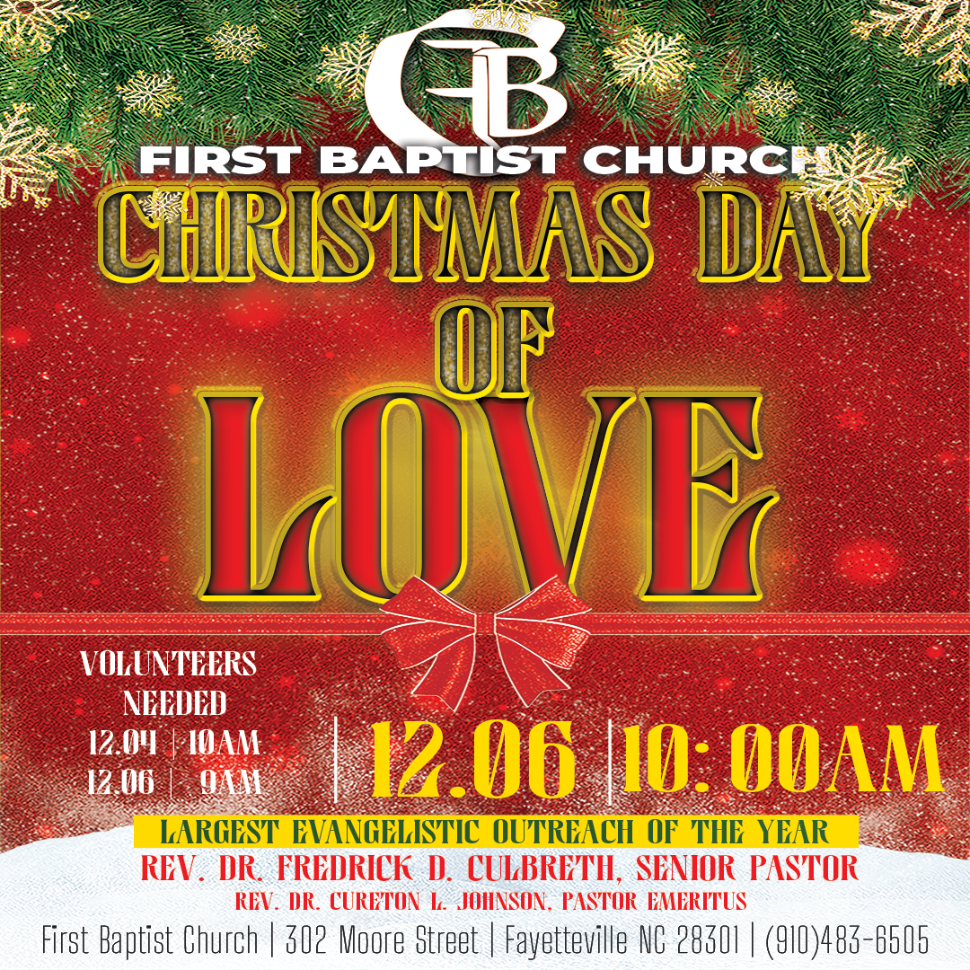 Here at FBC, we have two phenomenal events transpiring during the month of December. Christmas Day of Love, our largest evangelistic outreach event of the year takes place Saturday, December 6th at 10am. Should you want to volunteer, come out Thursday, December the 4th at 10am, we need all the help we can get.